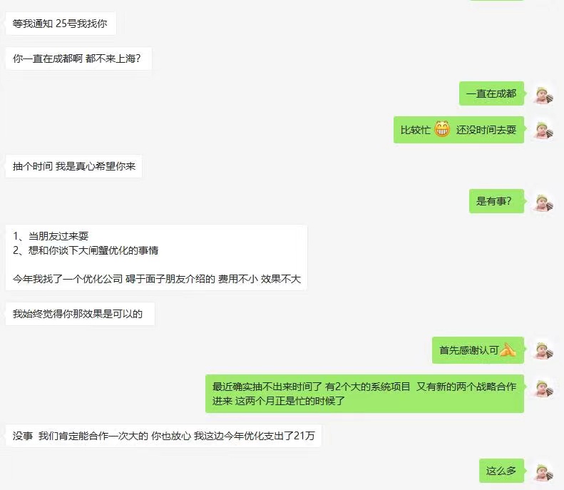 感谢【上海陆总】对推来客效果的肯定,还记得第一次合作是在18年左右,当时几个关键词找了3家网络公司都没做上去,后面找到我们试试。一个月左右就全部上永利最大(官方)网站了。客户那边产品有季节性,而且只做几个大词。中间断断续续合作过。客户中间也找过好几家其他公司了,几年下来,还是觉得我们效果是最好的。