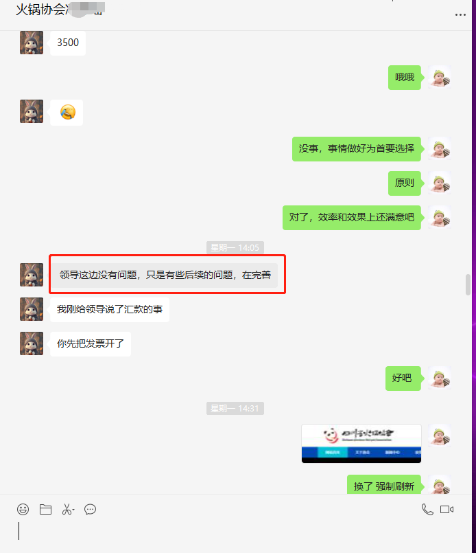 星期一协会领导也看过了,验收完美通过,其实按照约定,签订合同当天就需要支付定金50%,到现在为止,项目都已经全部完成并且验收通过,都还未支付款项的。当天开完发票后,第二天也成功收到全款。