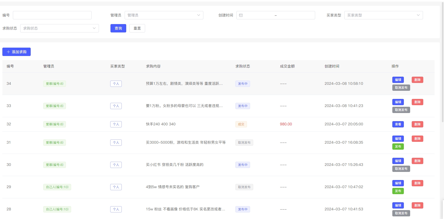同样B上传的求购数据. A和C.D也不能查看数据中的(买家昵称.联系方式)也无法修改.但其他数据可以查看如:求购内容.创建时间.编号.买家类型.修改权限仅B自己添加的才可以修改.开通了相对权限的管理员可以修改及查看