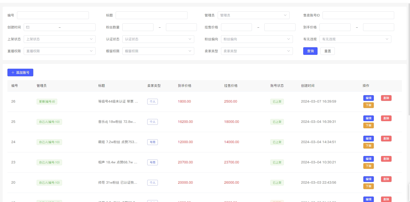 后台中所有账号数据和求购数据.普通管理员都可以看的到,(但账号ID.昵称.联系方式除自己上传的数据可以查看和修改.其他普通管理员无法查看到别人上传的账号ID.昵称.联系方式.开通了相对权限的管理员可以修改及查看)
