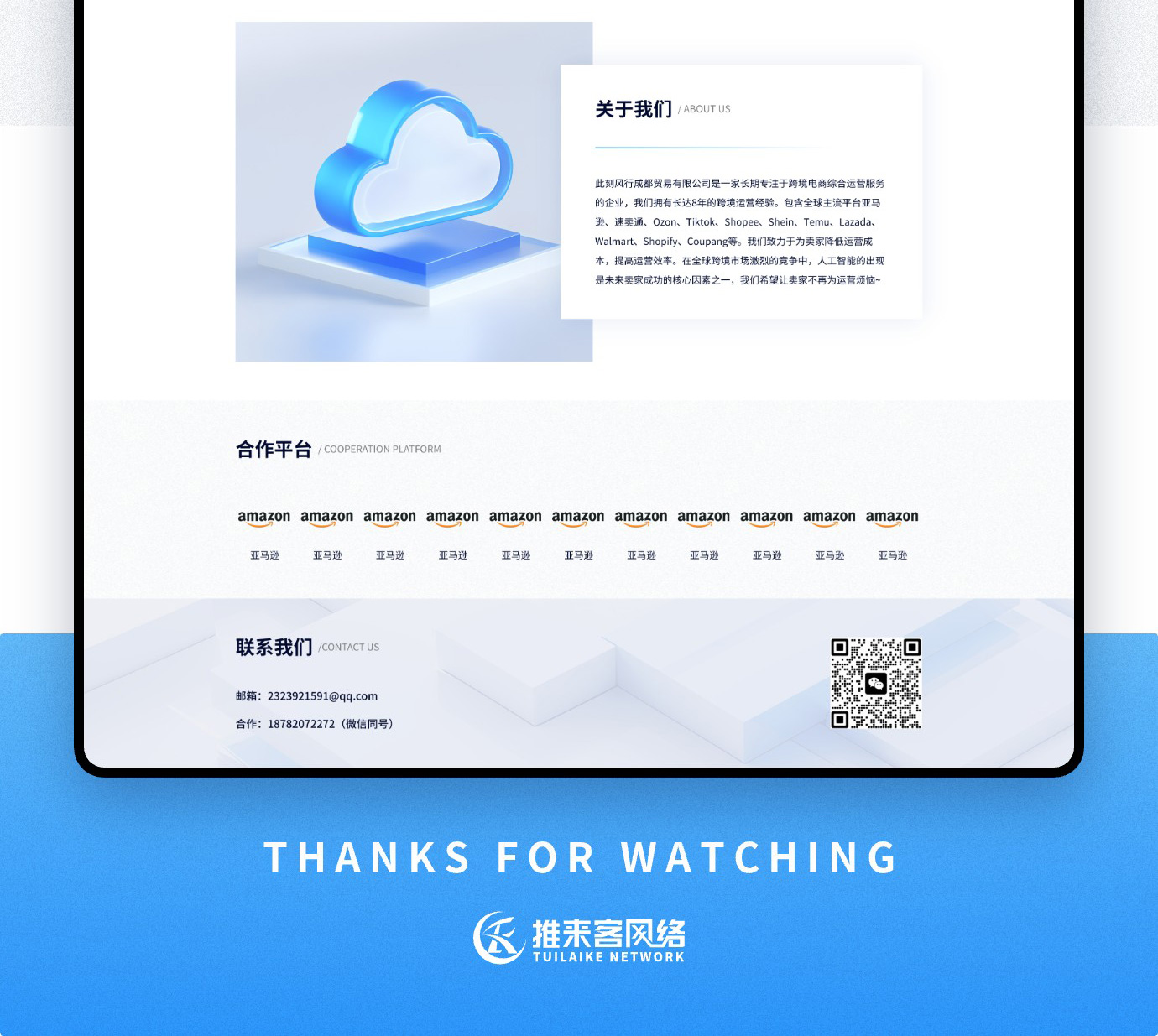 公司是一家长期专注于跨境电商综合运营服务的企业,我们拥有长达8年的跨境运营经验。包含全球主流平台亚马逊、速卖通、Ozon、Tiktok、Shopee、Shein、Temu、Lazada、Walmart、Shopify、Coupang等。我们致力于为卖家降低运营成本,提高运营效率。在全球跨境市场激烈的竞争中,人工智能的出现是未来卖家成功的核心因素之一,我们希望让卖家不再为运营烦恼。